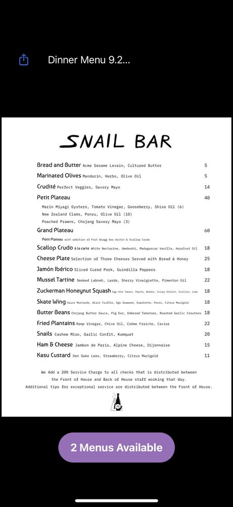 Snail Bar in Oakland, CA offers a unique dining experience with its ever-changing tapas menu and intimate, trendy ambiance. With a focus on seafood and small plates, this hipster spot has garnered praise for its creative dishes and attentive service. Customers rave about the chef's culinary skills, from oxtail arepas to crispy pork belly skewers. The menu features a variety of fresh seafood options, with standout dishes like oysters with passion fruit mignonette and honey glazed squash tostadas. While some find the prices on the higher side, the quality and presentation of the food make it a worthwhile splurge for seafood lovers. Overall, Snail Bar is a hidden gem for those craving a unique dining experience in the Bay Area.